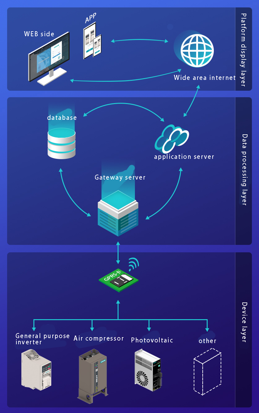 The basic architecture of the VEICHI IOT system is shown in the following figure. It consists mainly of the device layer (device, wireless data transmission module), data processing layer (gateway server, application server, and database) and platform display layer (WEB + mobile APP). The wireless data transmission module is used as the transmission medium, and the data interaction between the device end and the background server is connected, and the wide-area network is not restricted by the geographical limitation, and finally the purpose of remote intelligent supervision is achieved. VEICHI IOT system has wide applicability and scalability, and can be applied to general-purpose inverters, special inverters (such as air compressors, photovoltaic pump inverters, elevators and tower cranes), servos, PLC, etc. To help customers' production and services move toward digitalization and intelligence.