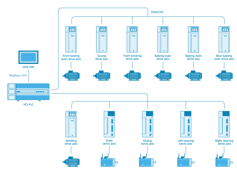 VEICHI has introduced a compound glue coater for various customer requirements. Leveraging our extensive industry expertise, this solution integrates VEICHI's VC5 motion controller, SD700 bus high-performance servo drive, and AC310 with PG and EtherCAT cards to control key motion axes including traction, gluing, and winding. It achieves high-speed, precision, responsive, and stable control.